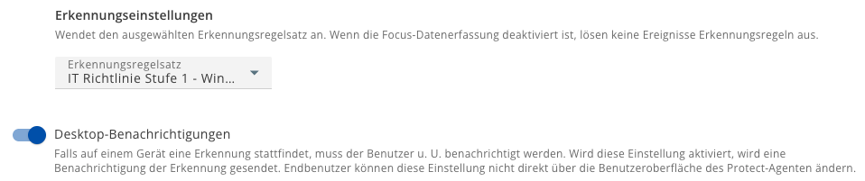 Wichtiger Hinweis: Wenn die Fokus-Datenerfassung deaktiviert ist, sammelt der Agent keine Telemetriedaten. Folglich werden keine Regeln ausgelöst, da die erforderlichen Ereignisdaten fehlen. Es handelt sich daher um eine Voraussetzung für eine funktionierende Echtzeiterkennung.