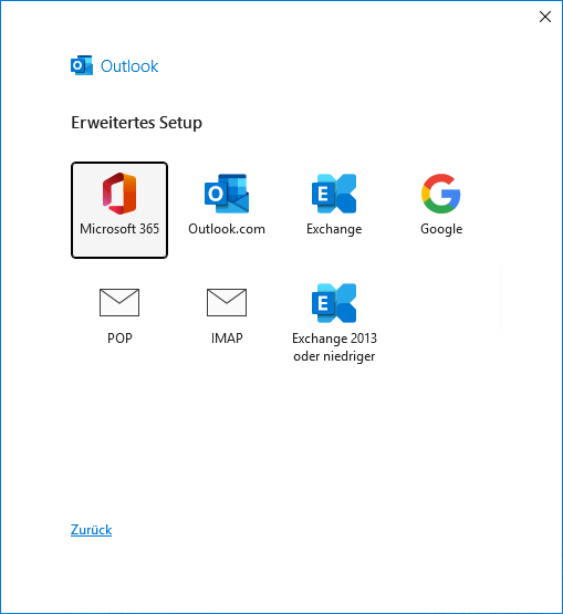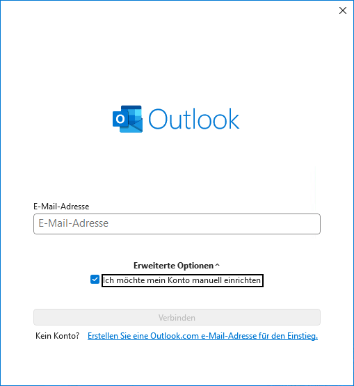 Erweiterte Optionen -> Ich möchte mein Konto manuell einrichten