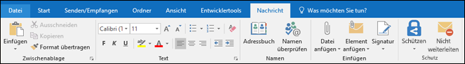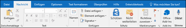 Abhängig von der Größe Ihres Outlook-Fensters und davon, ob Sie eine neue E-Mail-Nachricht oder eine Antwort verfassen oder weiterleiten, befinden sich das Menü Nachricht und die Schaltfläche Signatur möglicherweise an zwei verschiedenen Orten.