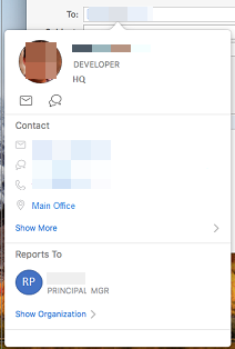 Geben Sie in das Feld 'An' die Namen der Personen oder Ressourcen ein, die für die Besprechung einbezogen werden sollen. Wählen Sie einen der Namen aus, um Details zu dieser Person anzuzeigen, einschließlich Telefonnummer, E-Mail-Adresse, Bürostandort und mehr.