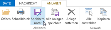 Klicken Sie auf der Registerkarte ‚Anlagen‘ in der Gruppe ‚Aktionen‘ auf ‚Speichern unter‘. Sie können auch mit der rechten Maustaste auf die Anlage klicken und dann ‚Speichern unter‘ auswählen.
