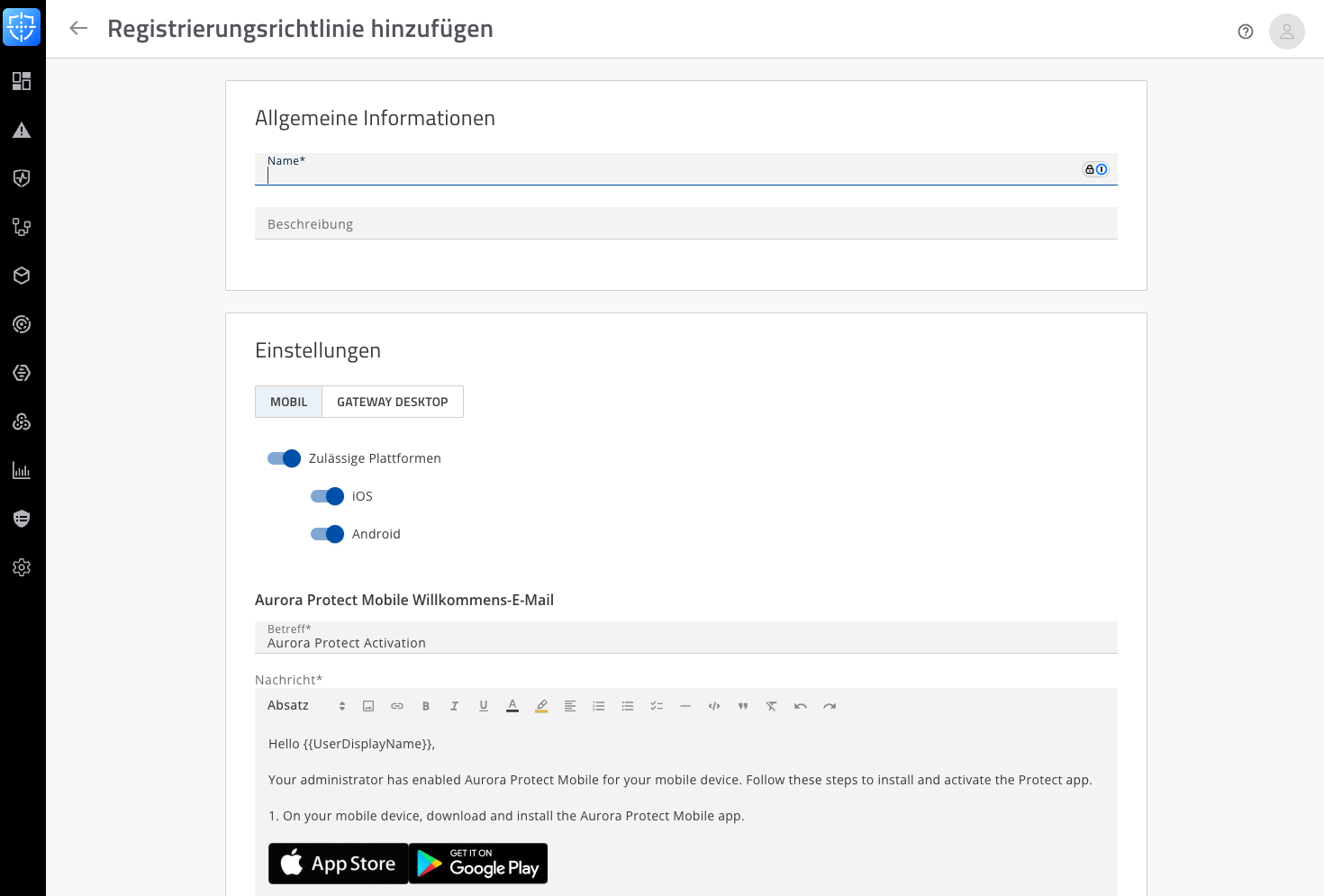 Die Mobile User Enrollment ermöglicht es, Benutzer für Aurora Protect Mobile einfach zu registrieren. Administratoren können Einladungen über die Konsole versenden, woraufhin die Benutzer eine E-Mail mit einem Registrierungslink oder einem QR-Code erhalten. Nach dem Download der App kann der Benutzer das Gerät durch Scannen oder Link aktivieren. So wird ein sicherer und zentral verwalteter Schutz für mobile Endgeräte eingerichtet.