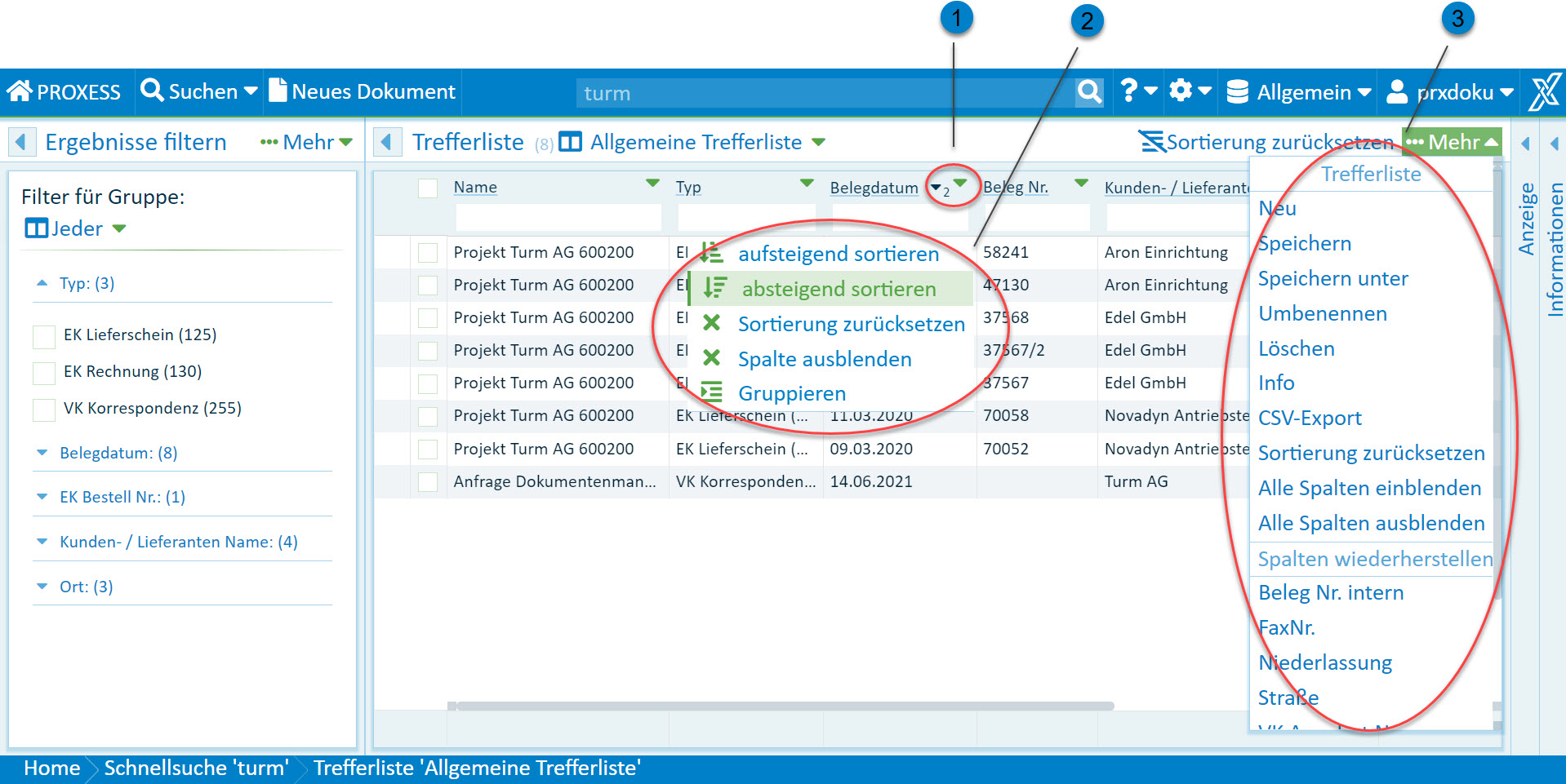 Ausgeblendete Spalten können Sie über das Trefferlistemenü wieder einblenden.