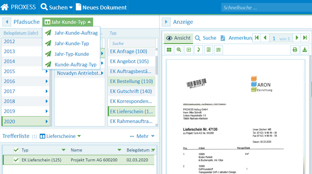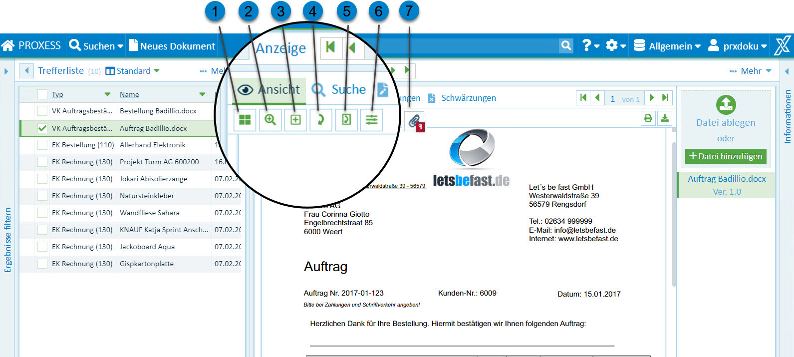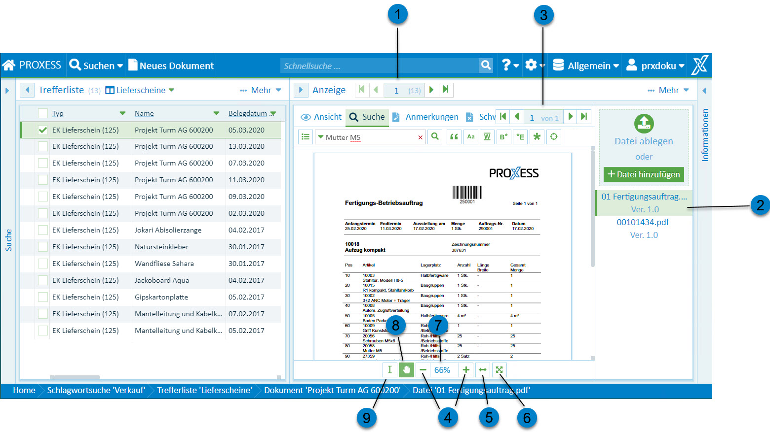Dokumente können mit PROXESS Web Client angezeigt, vergrößert, verkleinert werden und Sie können in den Dokumenten und Dateien blättern.