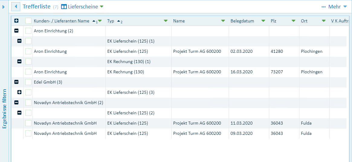 Die Gruppierung der Trefferliste kann nach mehreren Spalten hierarchisch erweitert werden.