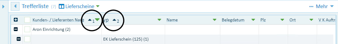 Sollen mehrere Spalten gleichzeitig sortiert werden, können Sie eine Hierarchie der Sortierungen vornehmen. Sie erkennen die Reihenfolge der Hierarchie an der kleinen Zahl neben dem Spaltentitel.