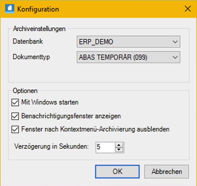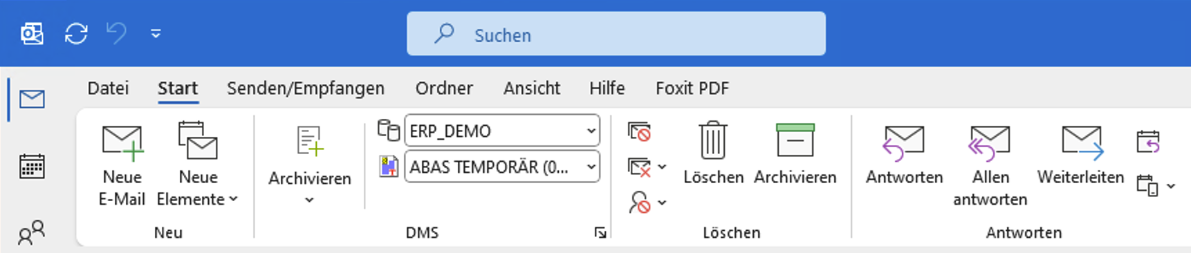 In Outlook gibt es ein Proxess Add-in "DMS" womit man E-Mails inkl. Anhang archivieren kann. Wie auf dem Bild unten zu sehen sind wir mit der Datenbank ERP_Demo verbunden und die Standard Belegart ist ABAS Temporär.
