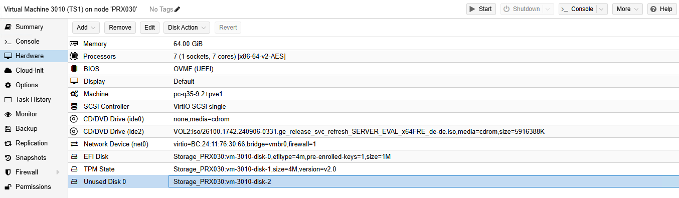 qm importdisk 3010 /Storage_PRX030/tmpimport/vm-100-disk-0.qcow2 Storage_PRX030 --format rawNach dem Import kann man die Festplatte in Proxess schon sehen dort muss diese dann noch zugewiesen werden.