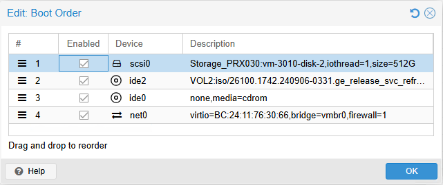 Wichtig ist auch das Ihr die Virtuelle Festplatte in den Optionen aktiviert und auch in der Boot Reihenfolge oben Positioniert.