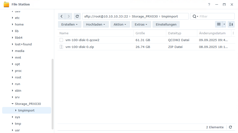 Hierzu habe ich die .qcow2 von 512 GB in eine .zip mit 25 GB gepackt und anschließend in den Storage Ordner tmpimport kopiert.