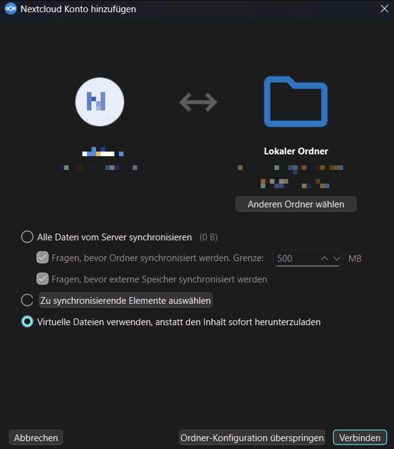 Jetzt sollte die Nextcloud Anwendung mit dem Server verbunden sein und man muss die Synchronisierung einstellen.