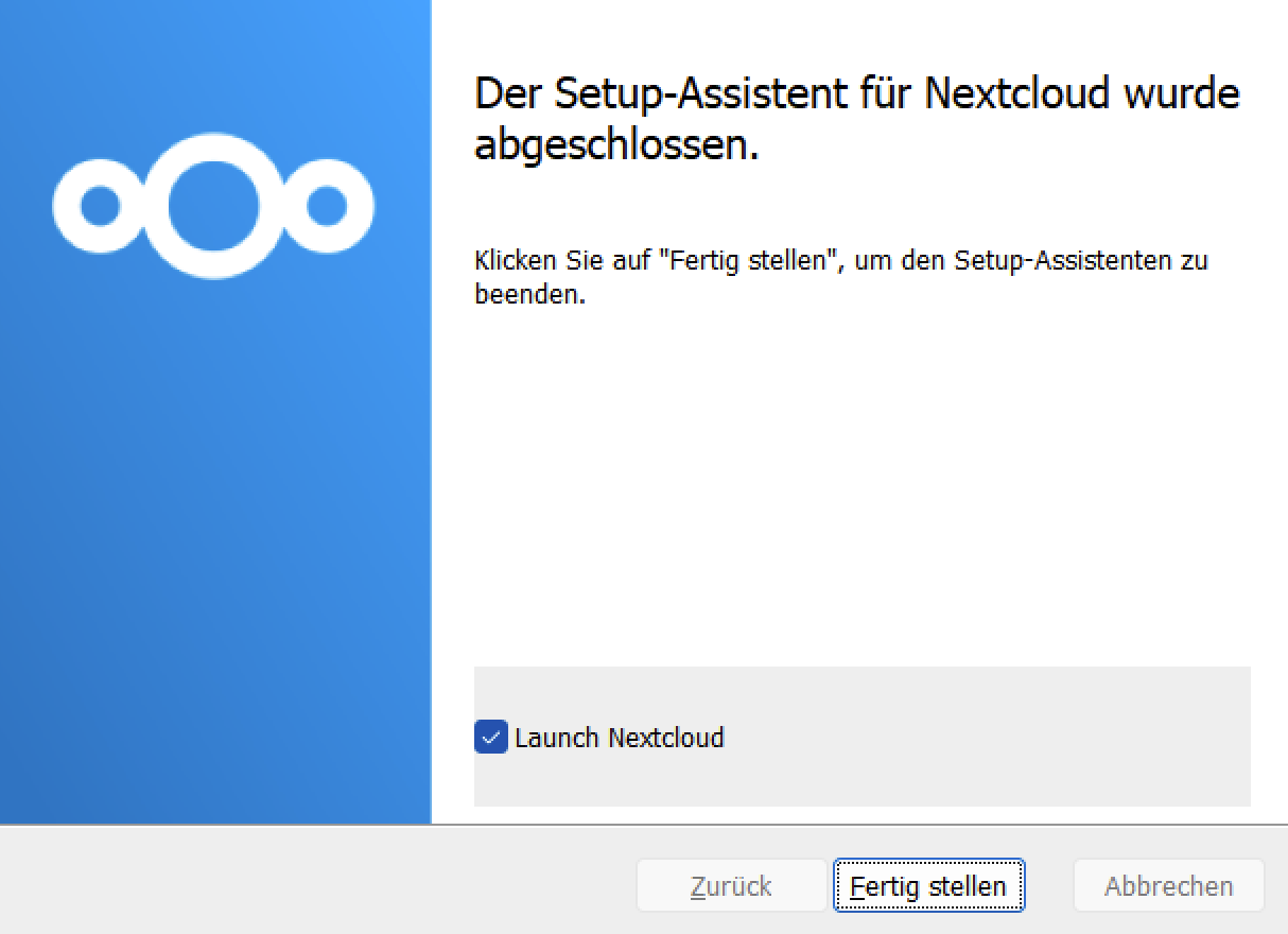 Nach der Installation auf Fertig stellen klicken darauf achten das Launch Nextcloud aktiviert ist.