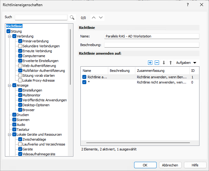Sie definiert verbindlich, wie sich der RAS-Client verhalten soll (z. B. Anzeigeeinstellungen, Gerätedurchleitung, Audio, Drucker usw.).